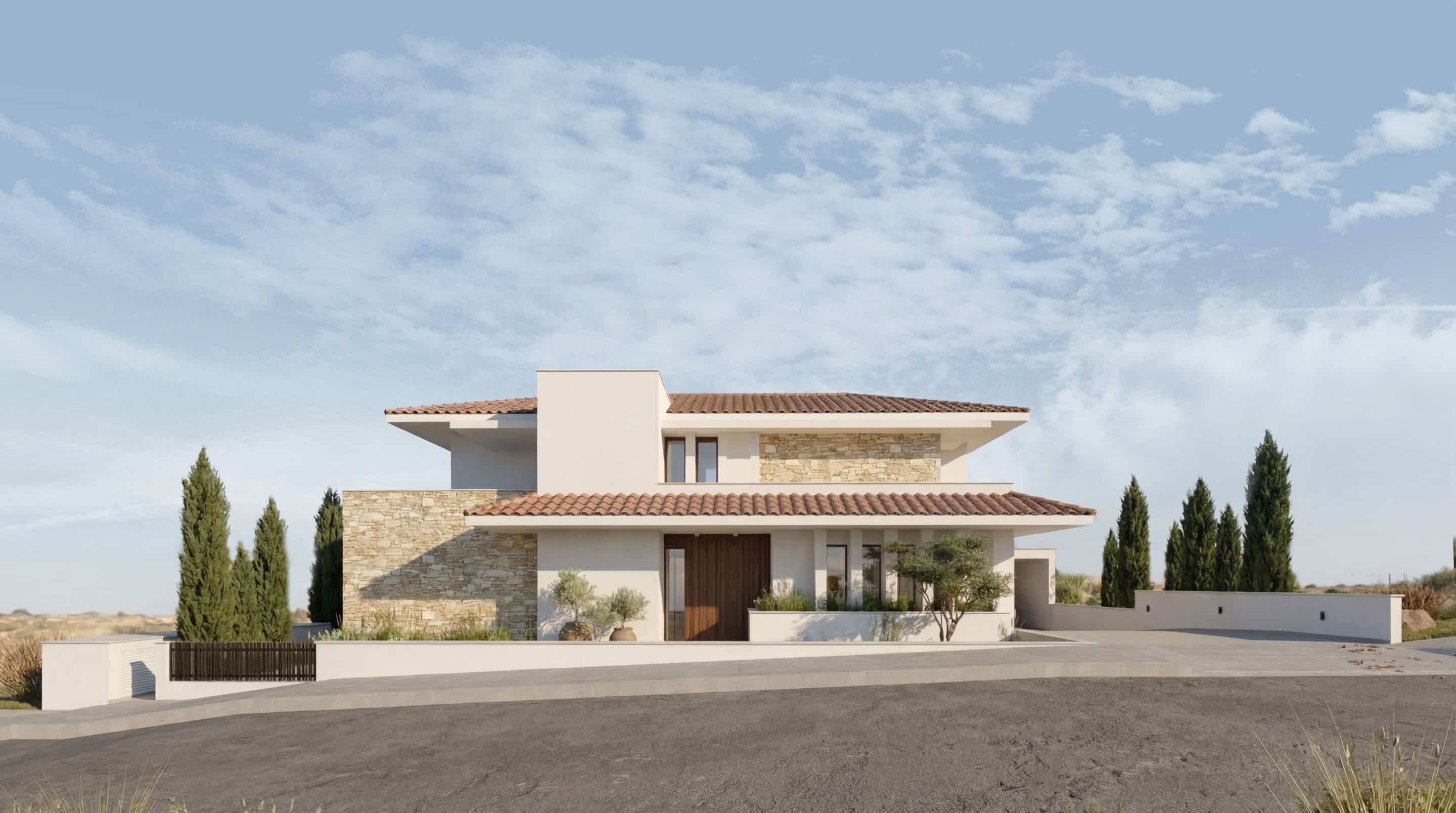 Perched on a rocky hillside in Episkopi, Limassol, this private residence is conceived as a contemporary expression of Mediterranean living, carefully shaped by topography, climate, and its commanding views toward Ancient Kourion and the sea beyond. Rather than imposing a singular object onto the terrain, the house unfolds in layered horizontal planes that follow the natural contours of the slope, with the main living level aligned to street access and volumes extending outward to frame the horizon. A linear infinity pool defines the edge of the plateau, establishing a measured threshold between architecture and landscape where water, sky, and coastline visually merge. Local stone walls anchor the building to the rugged ground, while smooth plastered volumes, deep overhangs, recessed glazing, and timber screens modulate light and shadow, reinforcing a sense of horizontality and climatic responsiveness. Outdoor spaces—covered verandas, shaded dining areas, and expansive terraces—are treated as integral rooms of the house, enabling year-round inhabitation and a seamless continuity between interior and exterior life. The residence reflects the owners’ vision of a dream lifestyle rooted in place: solid yet open, protective yet outward-looking, positioned between the archaeological memory of Kourion and the vast expanse of the Mediterranean landscape.